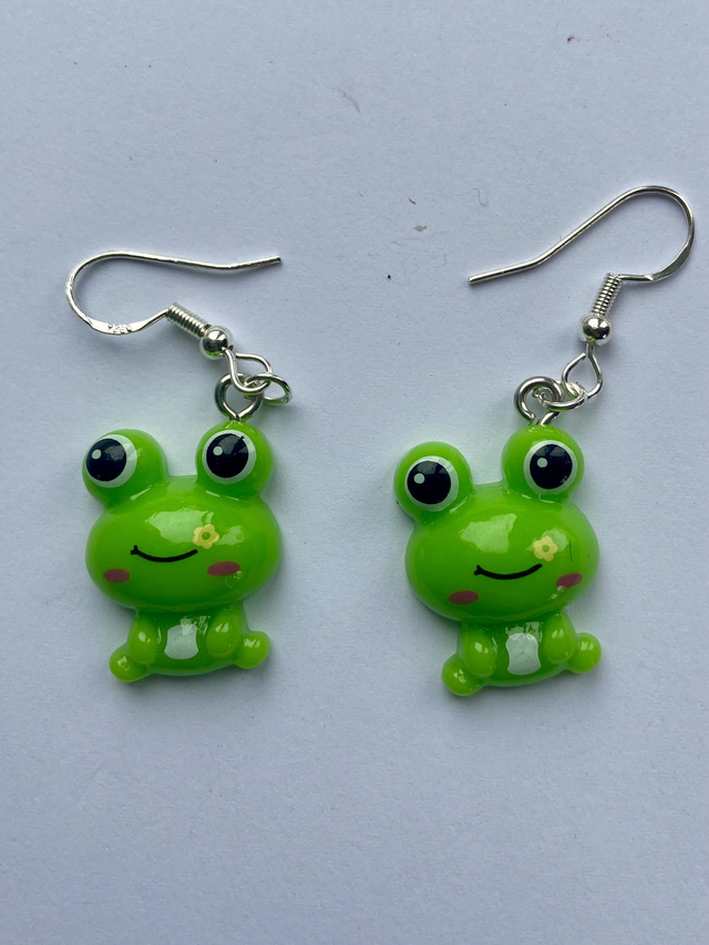 These are happy little frog earrings, made from acrylic with silver plated hooks.
