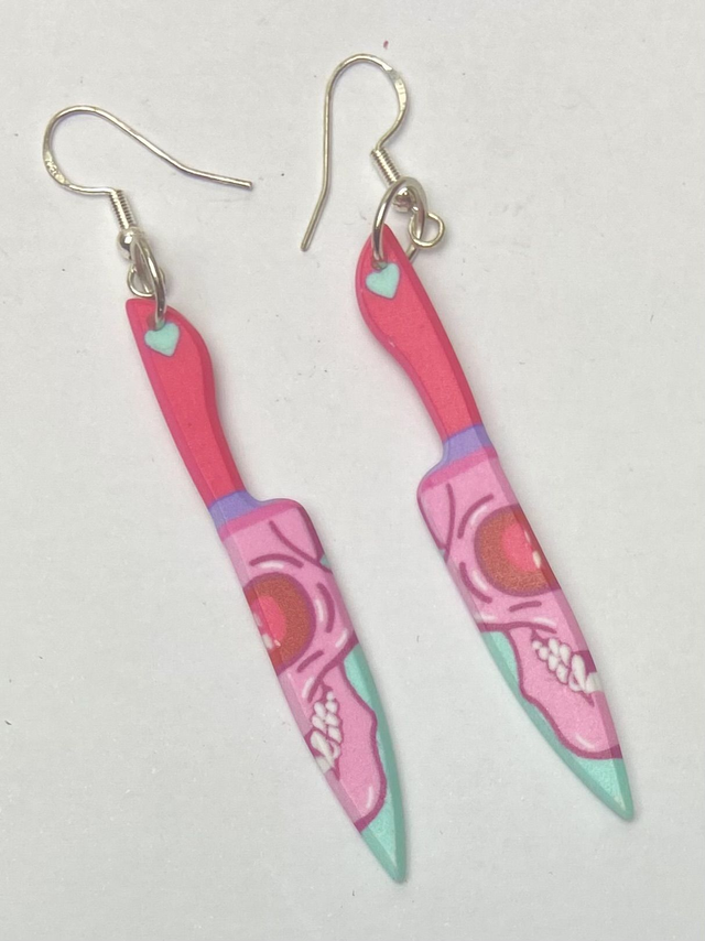 These earrings are knife shaped and have little skulls printed in them, made from acrylic with silver plated hooks.