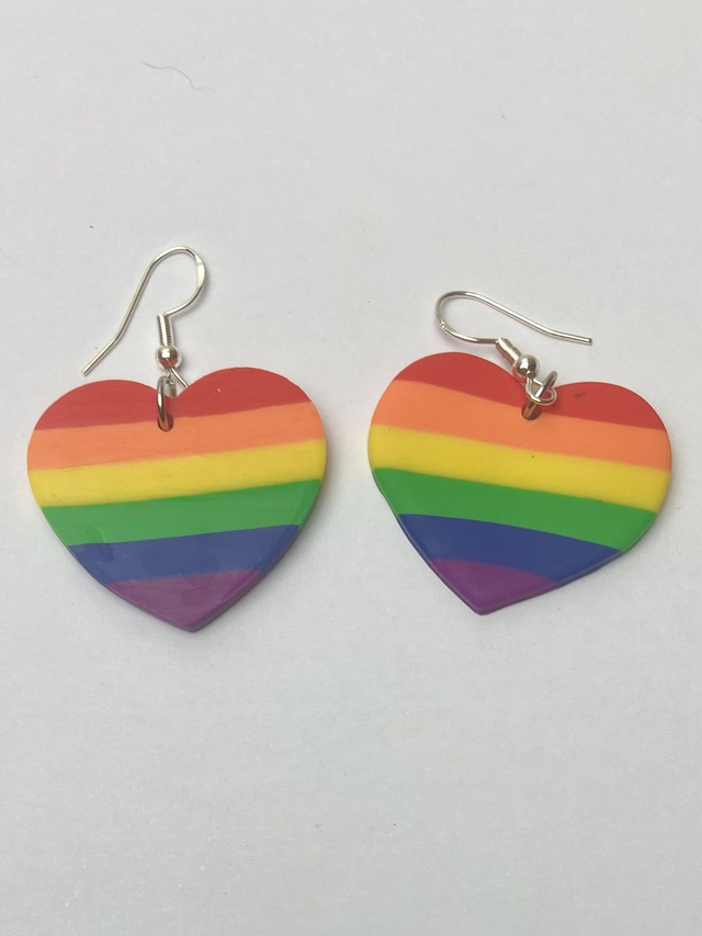 Love IS love. Rainbow heart earrings, made from rubber! Perfect for pride or just for those of you that LOVE rainbows, I know I do! These have silver plated hooks.