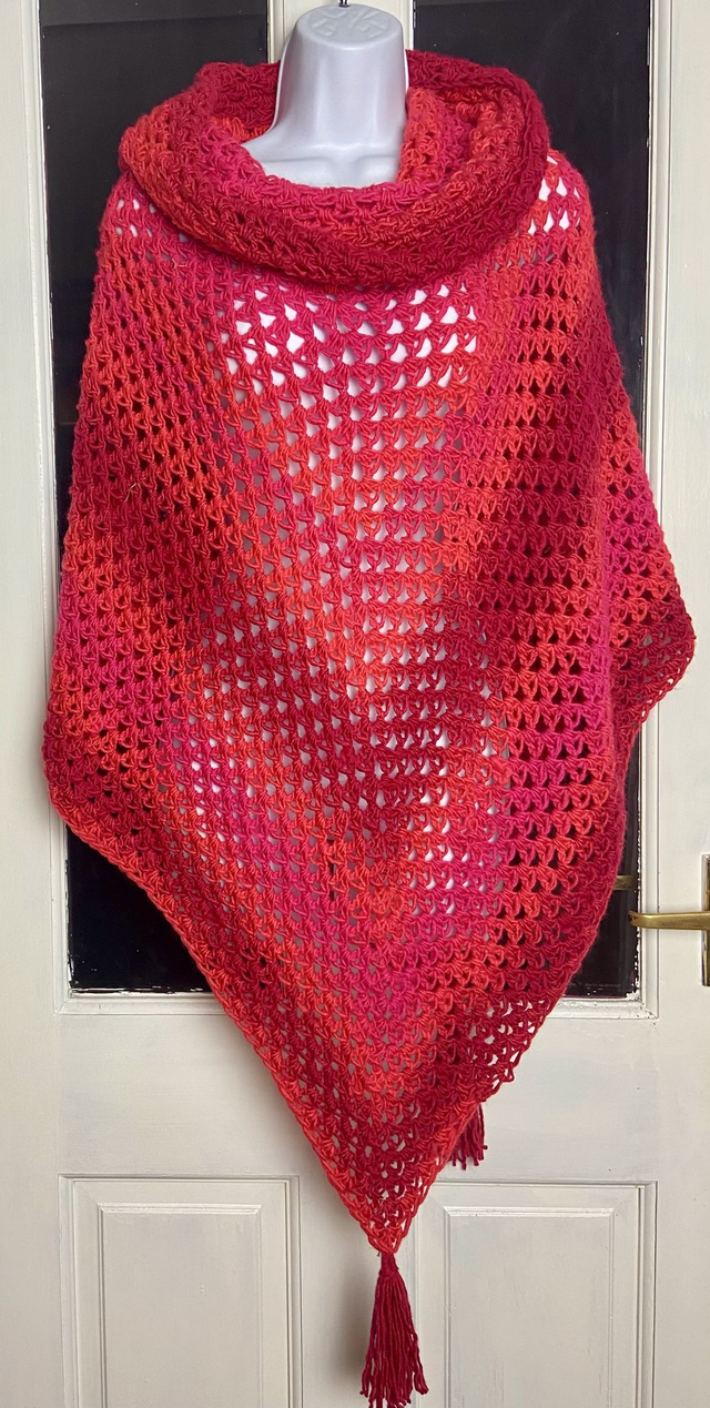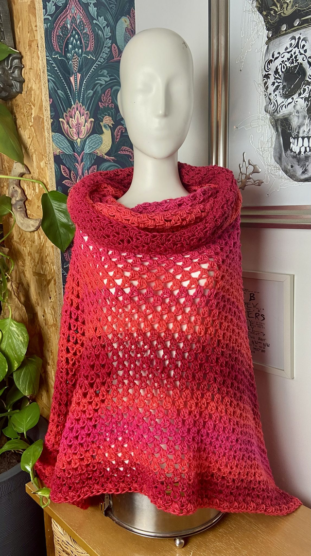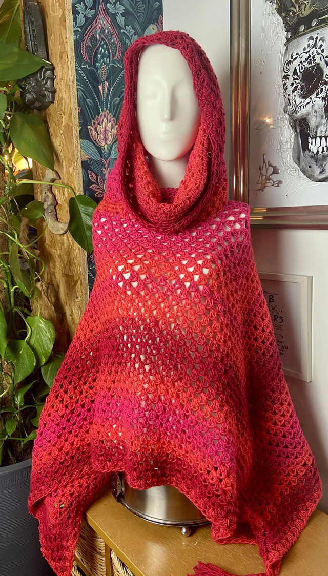 This red, ombré hooded poncho is perfect for the winter weather. Made from super soft, luxurious yarn but can still be washed at 30 degrees in the machine. What’s not to love? Will fit most bodies. Handmade, crochet.