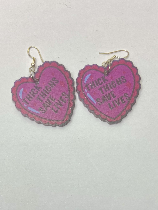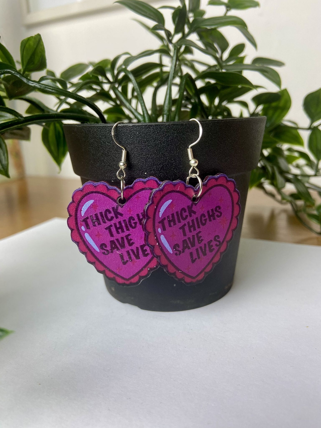 Purple acrylic love hearts that say ‘Thick thighs save lives’ and I believe they do, somehow. Anyway, these earrings have silver plated hooks and are rather fabulous.