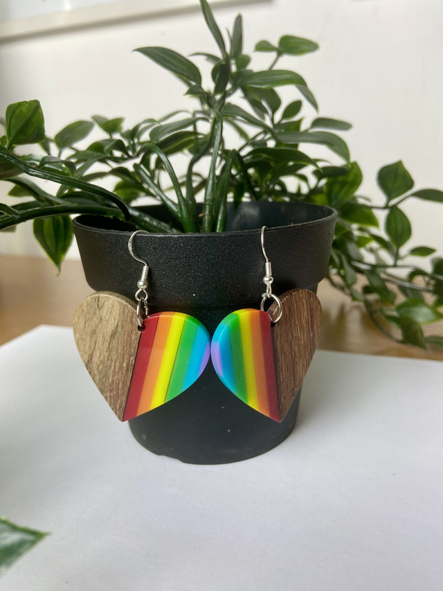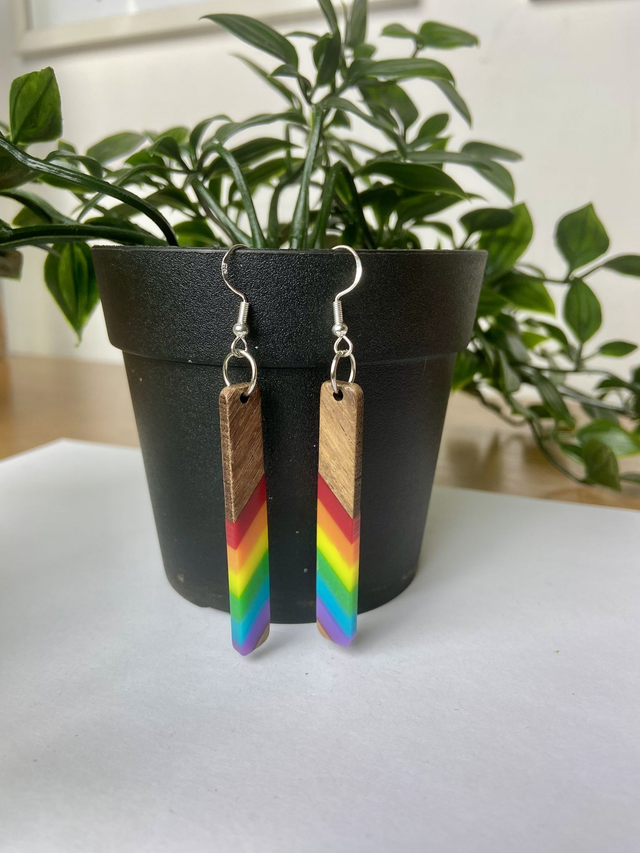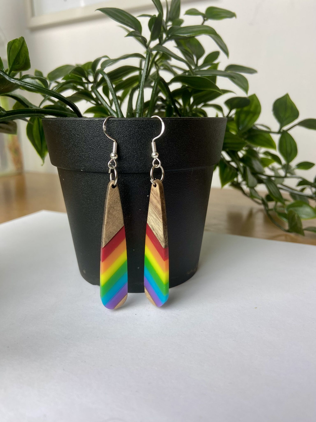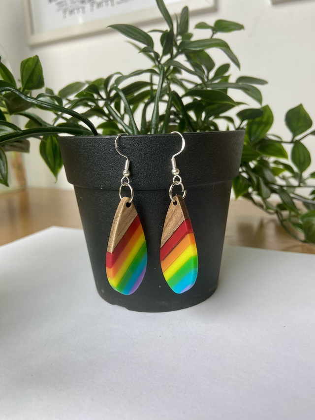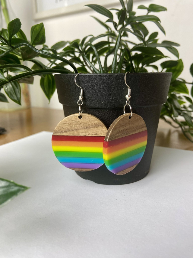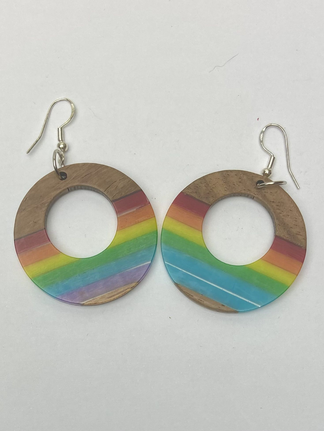 These earrings are really classy. They are acrylic, with silver plated hooks, and have a wood effect and rainbow design.